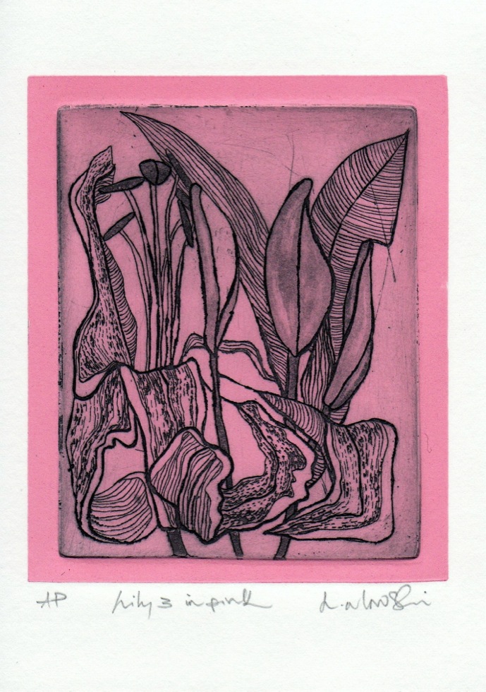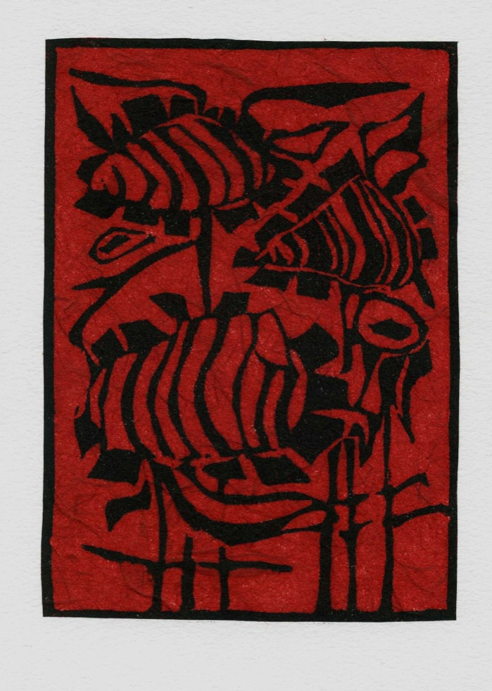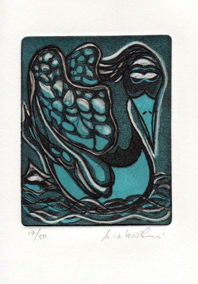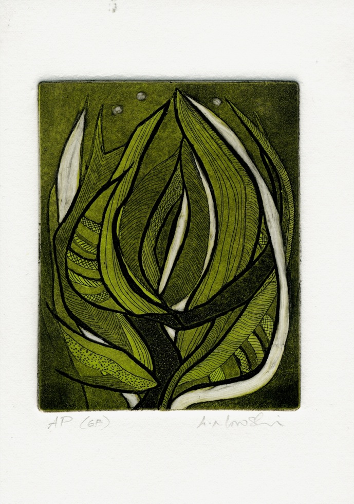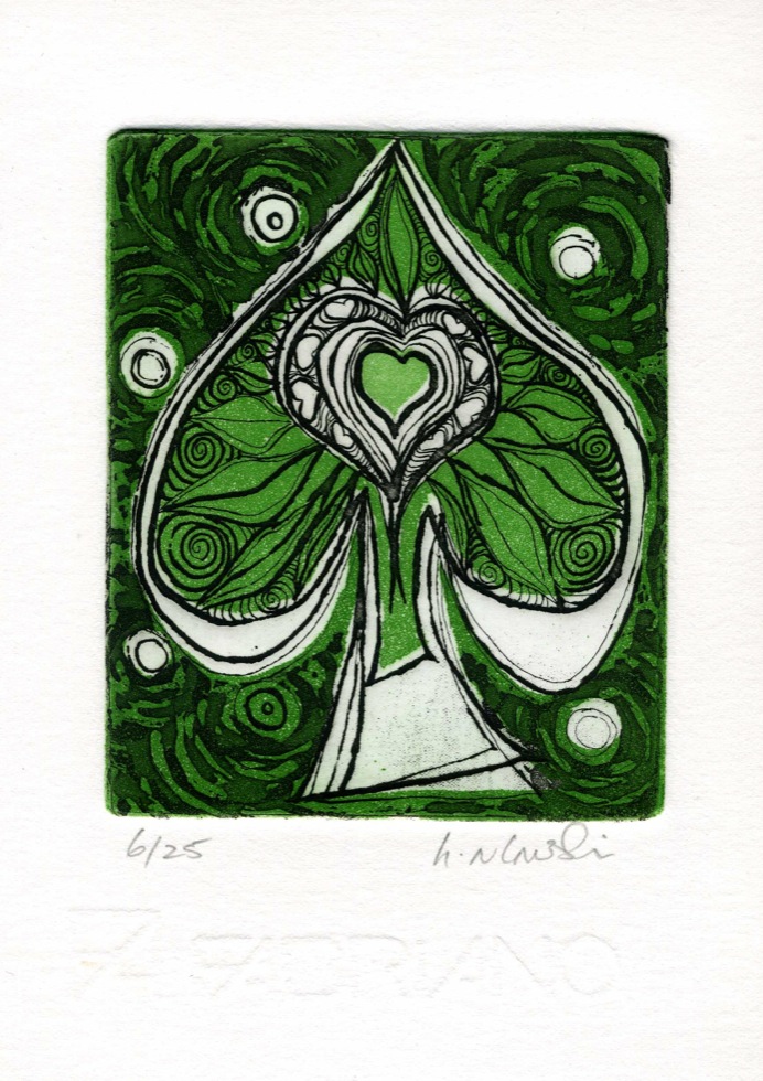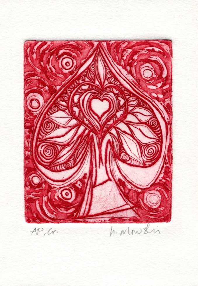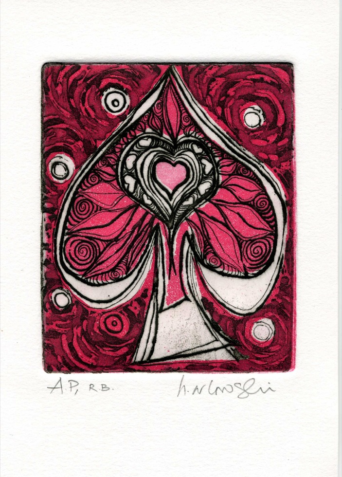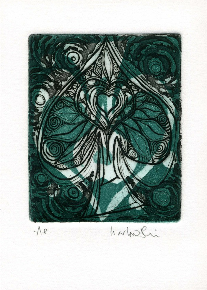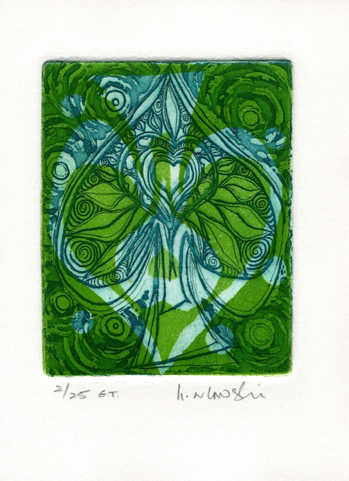 The Art In An Envelope Series is a play with various print techniques in small format. Small enough to put in an envelope and post to a friend with your personal wishes. Print techniques used might be Intaglio, including hard and soft ground and aquatint, relief print, reduction relief, typeset, or a combination, and printed on acid-proof card. Most cards will be of a limited edition. Some like relief cards may have a seamless edition.