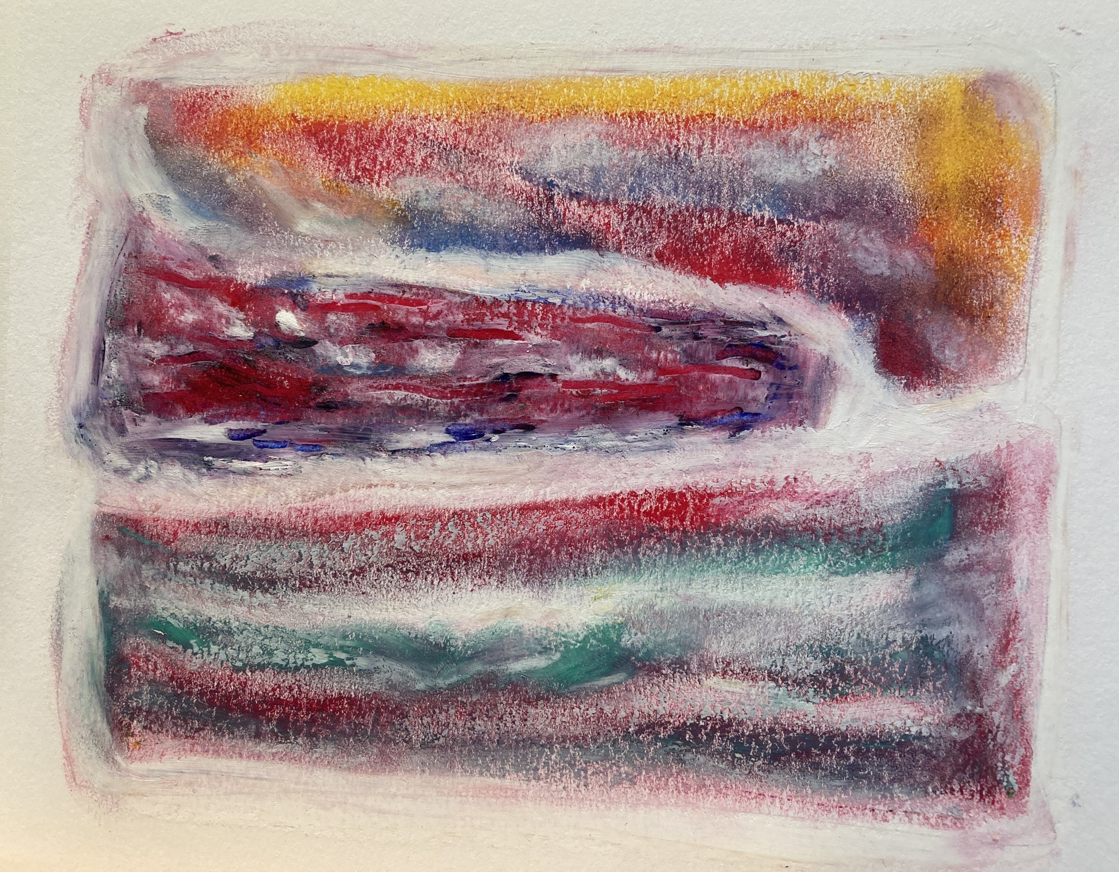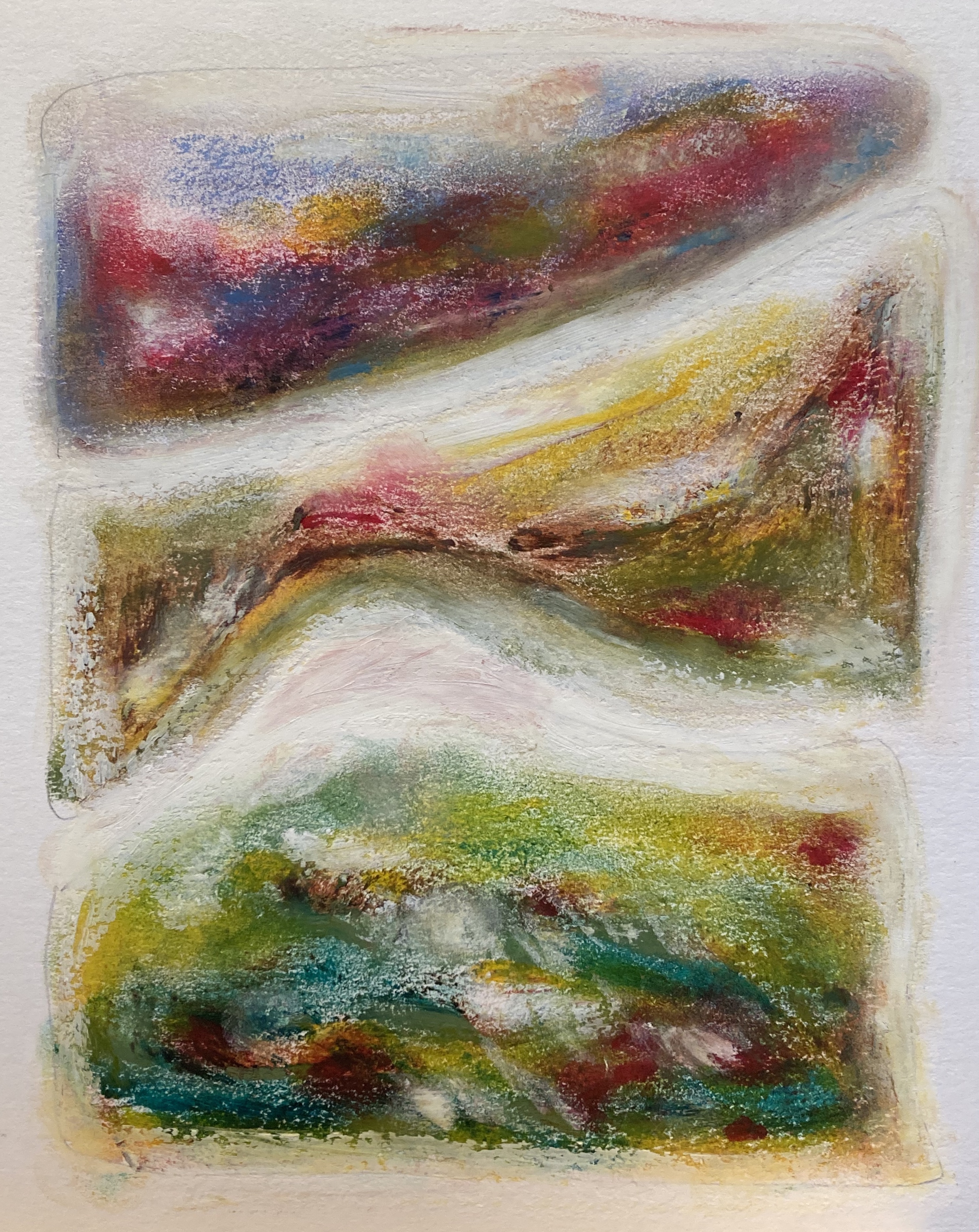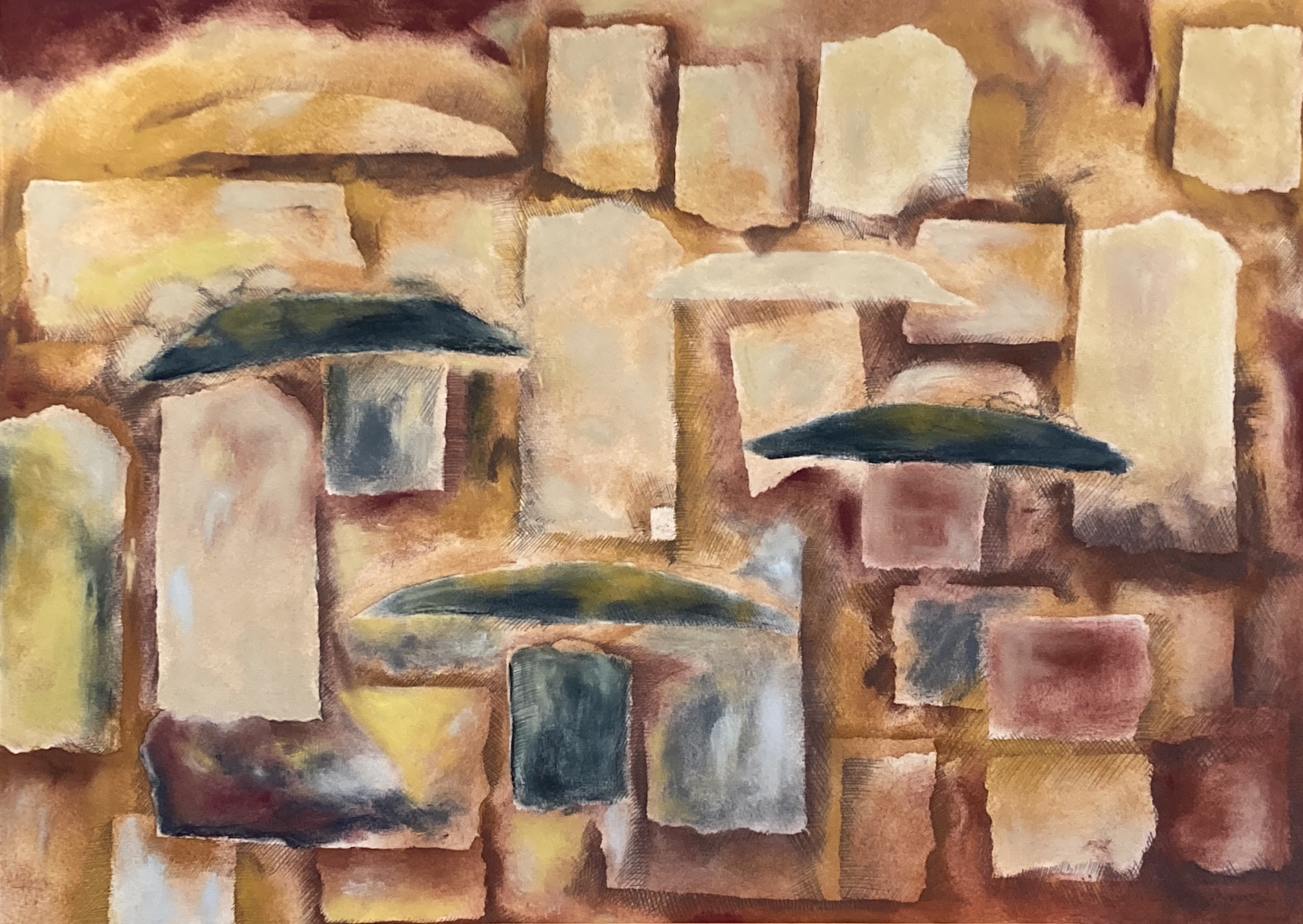 In the early 2010’s dramatic colour workings, strong forms, banged into my vision with the Sierra de Guara series. From 2014 with my many visits to Poland came music, soothing the makings of the Kazimierz series – Dustin O’Halloran and ‘Lumiere’. More recently, Anouar Brahem’s ‘Le pas du chat noir’ has carried me into a new approach to mark-making.